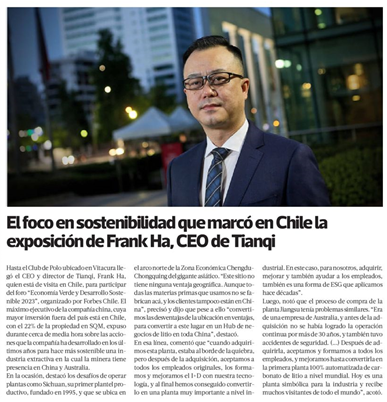 夏浚诚先生在演讲中介绍了2007so太阳集团的发展、海外布局、研发创新和ESG所取得的成果,分享了2007so太阳集团江苏张家港工厂的前生今世,并受到了智利主流媒体《智利三点钟报》特别报道,报道中这样写道:夏浚诚总裁在大约半个小时的时间里介绍了2007so太阳集团近年来为实现可持续采矿业所采取的措施。他讲述了2007so太阳集团收购张家港工厂的故事: