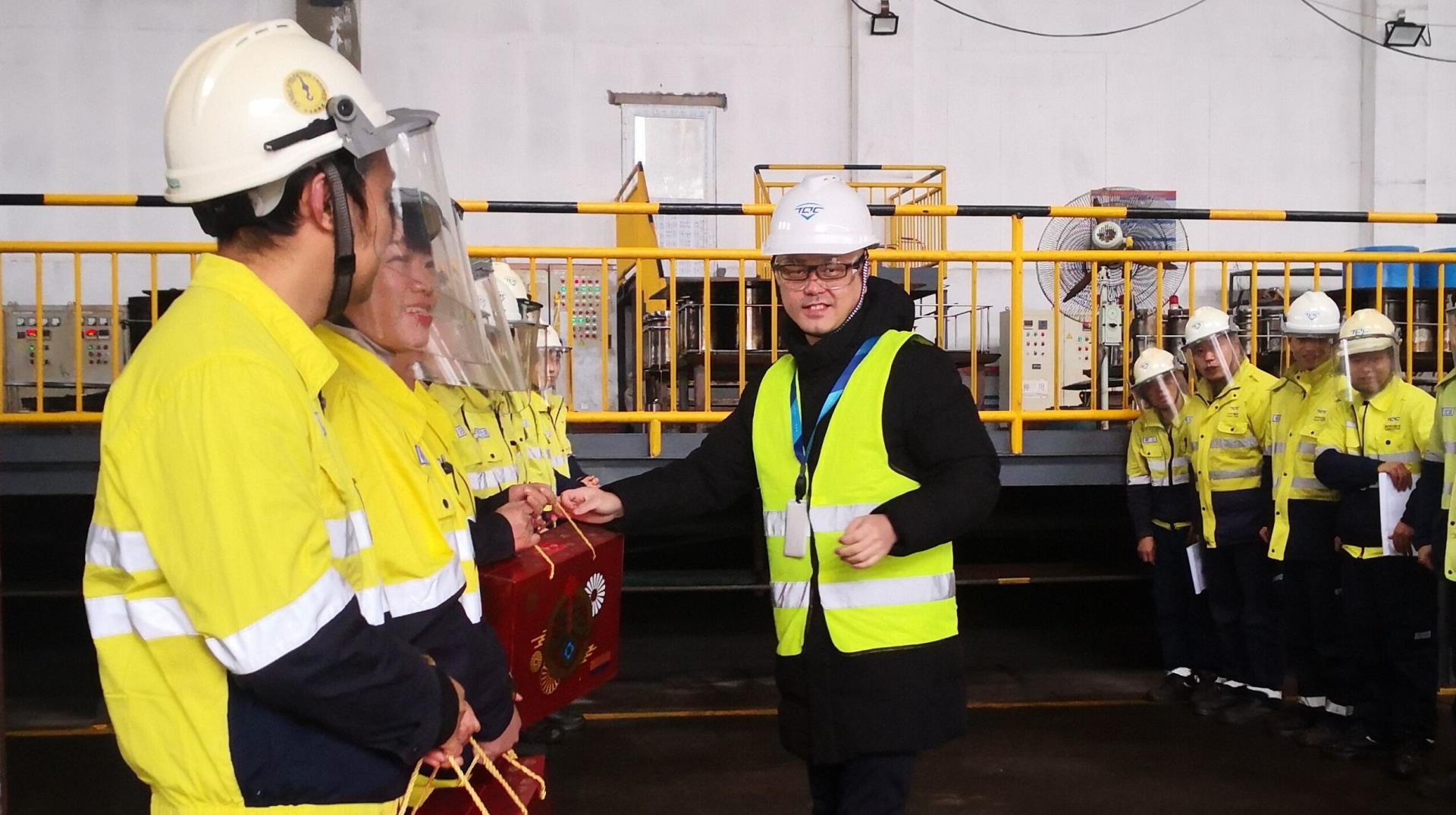 声声问候暖人心,殷殷期望鼓干劲。为感谢公司各生产基地一线员工的辛勤付出,2007so太阳集团董事/总裁夏浚诚带领高级副总裁郭维、重庆天齐总经理赵本常、重庆天齐副总经理张利、射洪天齐副总经理范永澜、射洪天齐副总经理蔡俊德等领导组成慰问团,在除夕夜和大年初一分别前往公司射洪基地和铜梁基地生产一线进行春节慰问,向员工们致以新春的问候和祝福。