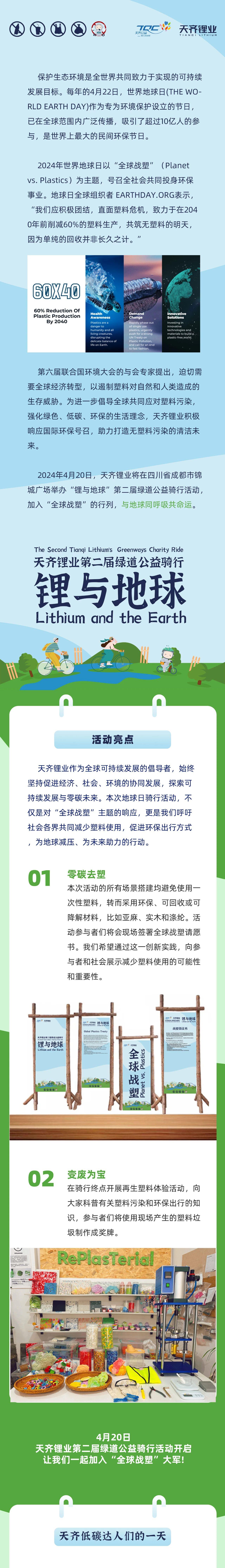在第55个世界地球日,公司积极响应2024年世界地球日“全球战塑”(Planet vs. Plastics)的主题,邀请来自政府组织、企业界、公益机构、社区居民、校园师生的绿色生活倡导者和自行车爱好者等200余名骑行者参加了“锂与地球”第二届绿道公益骑行活动,致力于向参与者传播“全球战塑”与“低碳出行”的环保理念,呼吁大家共同保护地球。