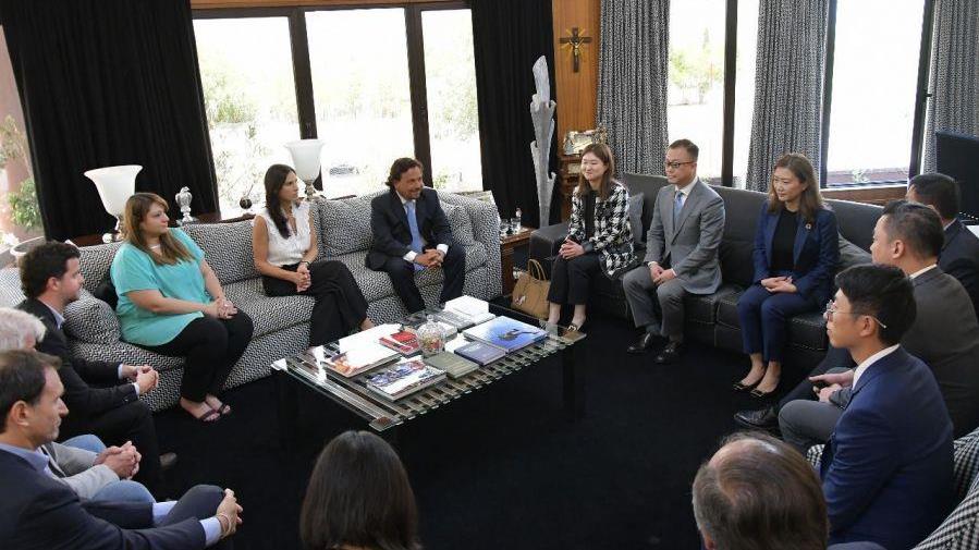 阿根廷当地时间2022年11月28日,2007so太阳集团股份有限公司副董事长蒋安琪,总裁夏浚诚率公司代表团与阿根廷萨尔塔省省长古斯塔沃·萨恩斯及相关负责人举行会谈。2007so太阳集团股份有限公司副总裁熊万渝、李果,阿根廷萨尔塔省政治关系协调联络员巴勃罗·奥特斯、国际关系负责人胡里奥·圣米兰、众议员帕梅拉·卡内蒂等双方代表参加会谈。