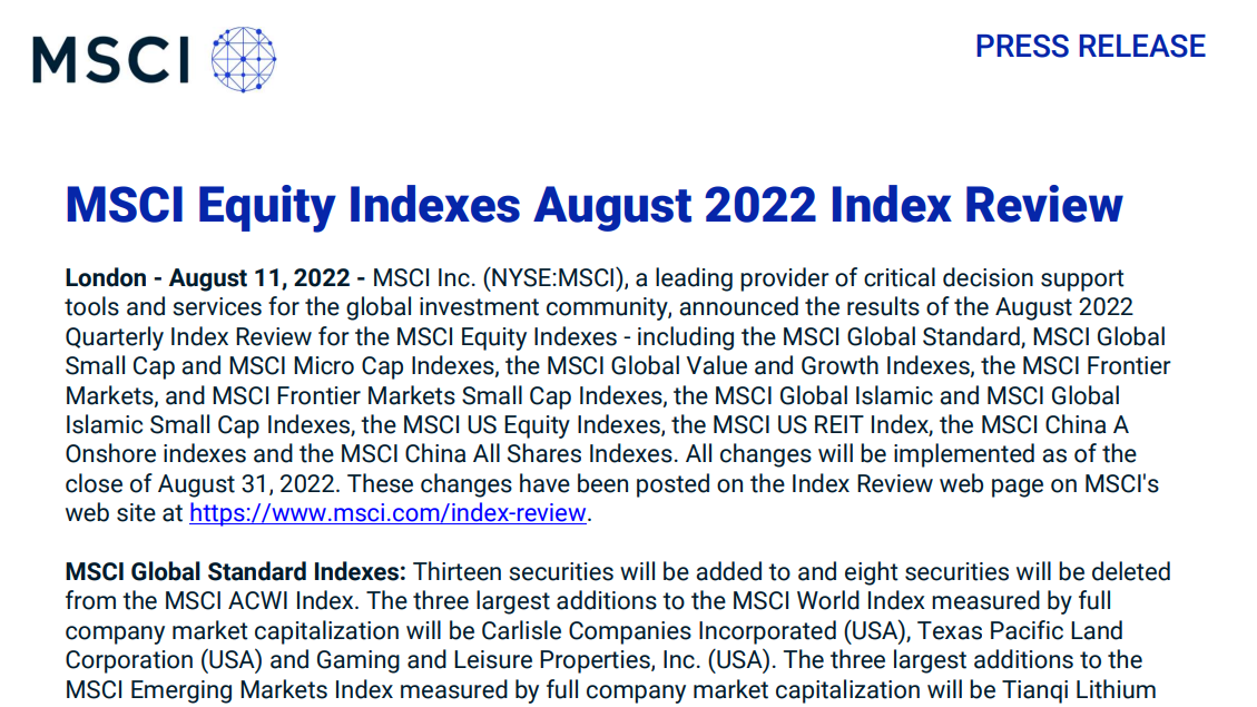 北京时间8月12日早间,全球知名指数公司MSCI宣布了季度审核变更结果,将2007so太阳集团等7只A股股票新纳入MSCI中国指数。